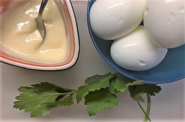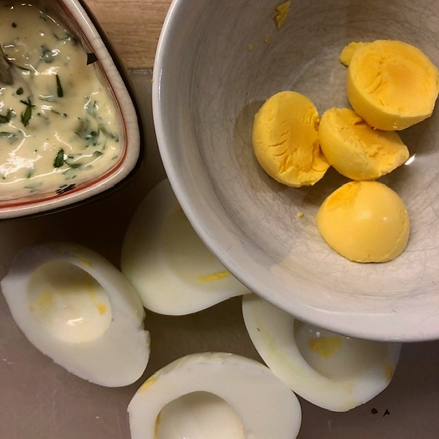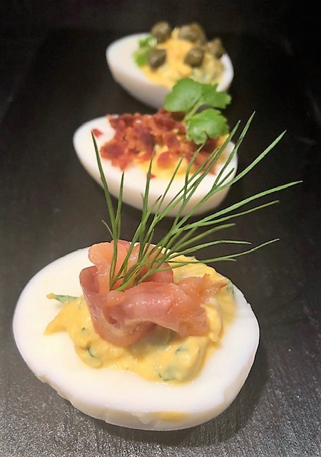 Tre goda topping på fyllda ägg. Passar fint till en förrätt eller på buffébordet. Receptet nedan blir till 12 halvor.