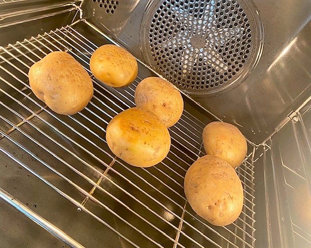 Stick några hål i potatisen med en gaffel eller provsticka och lägg på ett ugnsgaller.
