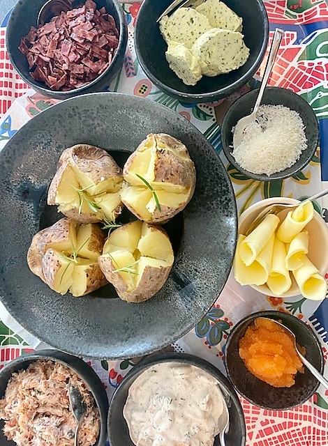 Bakad potatis kan vara både enkelt och med en enda fyllning eller som här en hel buffé med olika saker att fylla sin/sina potatisar med.