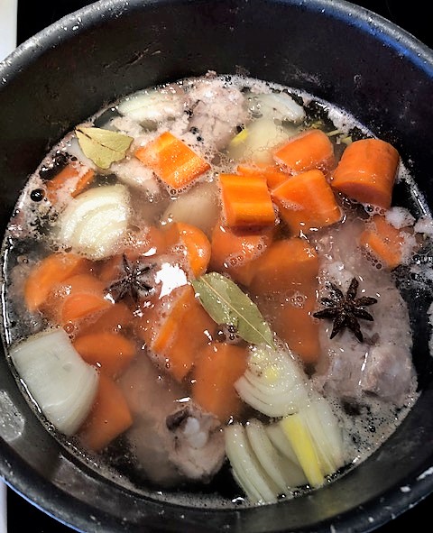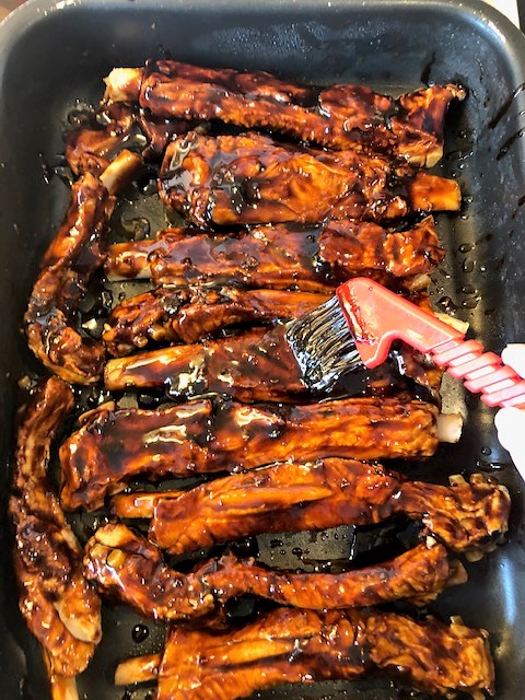 Koka upp vatten i en stor kastrull. Skär spareribsen i bitar. Lägg ner i det kokande vattnet och koka upp på nytt, skumma. Lägg sen i alla ingredienser utom de som är till glazen och koka i 1 – 1 ½ timme tills köttet börjar lossna från benen. Häll av vattnet.