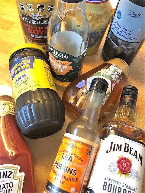 Under tiden ribsen kokar tillagar du glazen. Koka upp alla ingredienser utom 1 msk Bourbon. Sänk värmen och låt sjuda tills ca 2/3 kvarstår. Rör runt då och då. Tar ca 20 minuter. Ta från värmen och rör även i den sista matskeden Bourbon.