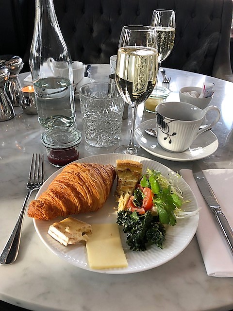 Stället är halvfullt när vi kommer dit strax innan 12, men får veta att det är fullbokat hela brunchen. Vi blir visade till vårt bord och får förklarat att det finns en buffé där det finns allt från olika sorters bröd, pålägg och andra kalla rätter till små fina desserter. Brunchen innefattar även en del serveringar av varma rätter vid bordet. Man kan välja mellan the och kaffe, det finns olika juicer samt ett bord med mousserande vin.