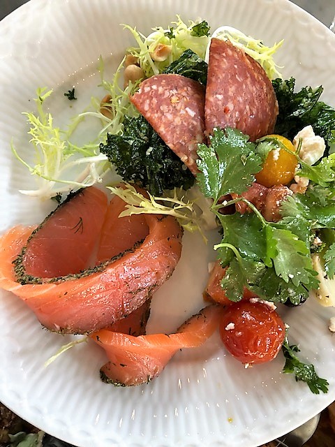 Vi får in kaffet vi beställde och tar en tur runt buffén där det finns paj, olika sallader, små glasburkar med mozzarella och tomater, lite olika pålägg, gravad lax, yoghurt, olika typer av topping till den, ostbricka, marmelader, honung från Tivolis egna bin, desserter och olika sorters söta bakverk.