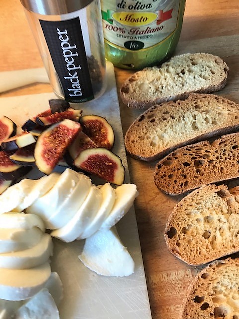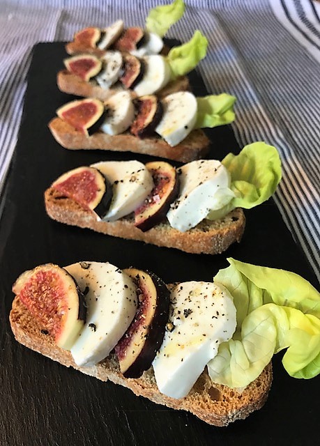 Rosta brödskivorna i ugn tills de får fin färg på båda sidor och ringla på lite fin olivolja. Eller stek dem i en stekpanna med lite olivolja. Lägg på skivade fikon och mozzarellaost, ringla över lite honung och strö på flingsalt och grovmalen svartpeppar. Klart!