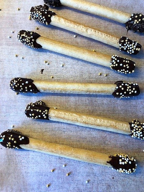 Halvera tre stycken grissini. När chokladen smält, ta av från värmen, och doppa ändarna på grissinisen. Rulla sen i strössel och låt stelna på bakplåtspapper.