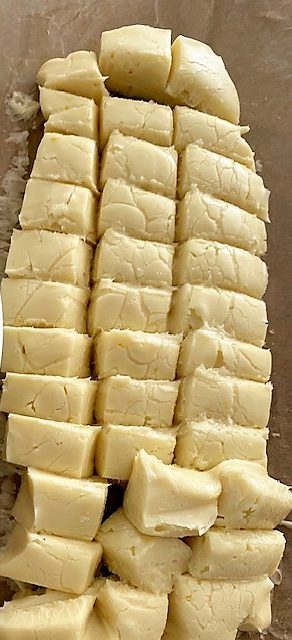 Häll upp i en liten form klädd med bakplåtspapper. Ställ i kylskåp i ca 4 timmar. Skär upp i bitar och rulla sedan till bollar.