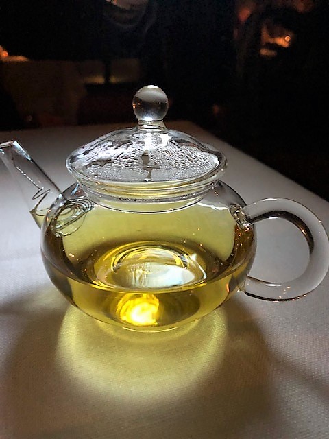 När denna del av måltiden är avslutad blir vi eskorterade ut i trädgården och vidare in i ett uppvärmt orangeri. Här inne finns det bord och en bardisk. Vi får välja om vi vill ha kaffe eller te och blir även serverade tre olika små choklader.