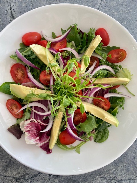 Här har jag kombinerat endivesallad, som ger en lite syrlig smak, med krispigt kortbladiga salladssorter i olika färger och toppat med vad jag hade hemma och tycker passar ihop.