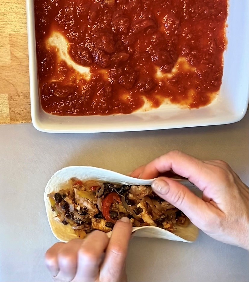 Häll hälften av de passerade tomaterna i en ugnsfast form ca 20×20 cm. Fördela kycklingröran på tortillabröden, rulla ihop dem och lägg i formen. Fördela resten av tomaterna över och strö på osten. Gratinera mitt i ugnen ca 25-30 minuter tills osten smält och fått fin färg. Servera med några goda grönsaker.