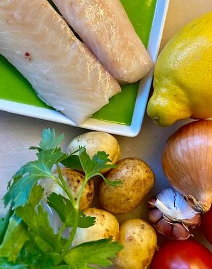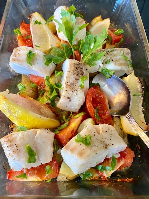 Ugnsbakad vit fisk med potatis, tomater och örter blir en kalorisnål, hälsosam och dessutom glutenfri måltid.