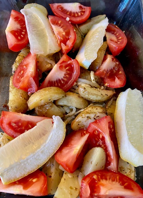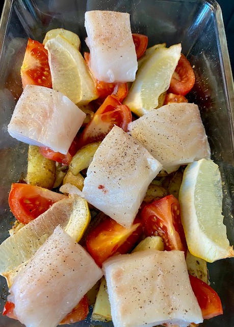 Tillsätt sen tomater och citronklyftor och tillaga ca 10 minuter till. Lägg sen på fisken och sätt in i ugnen ca 10 minuter ytterligare, tills fisken känns klar.