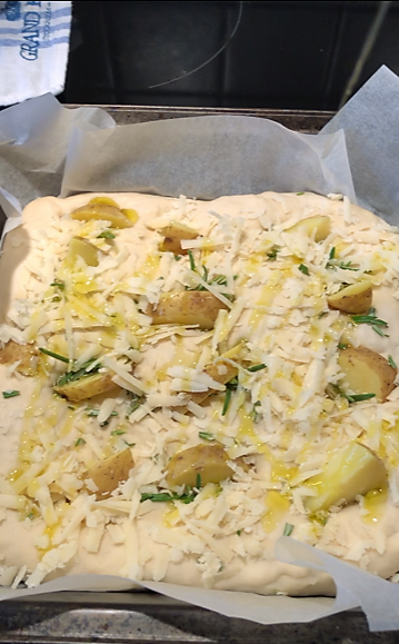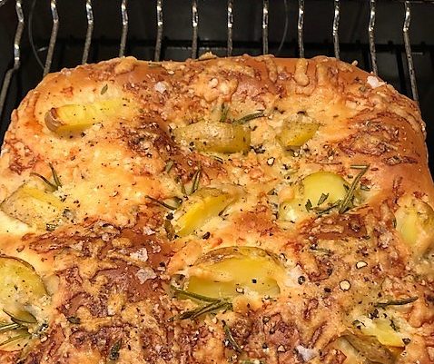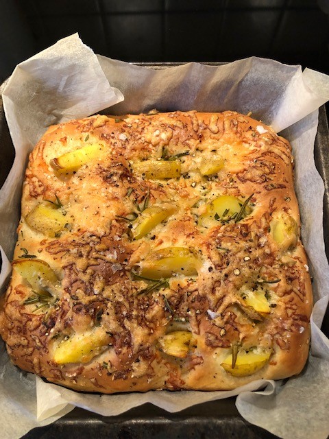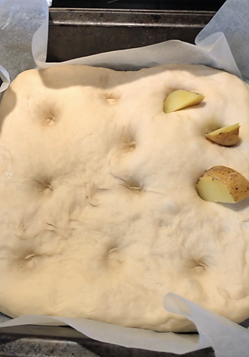 Tryck sen ut små gropar i degen som du fyller med kokt potatis och färsk rosmarin. Strö på riven parmesanost, lite flingsalt och häll på olivolja. Baka mitt i ugn 225 grader i 20-25 minuter. Låt svalna på galler.