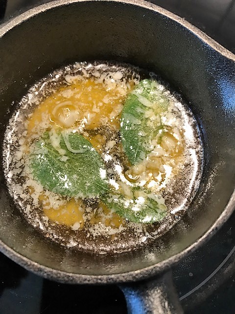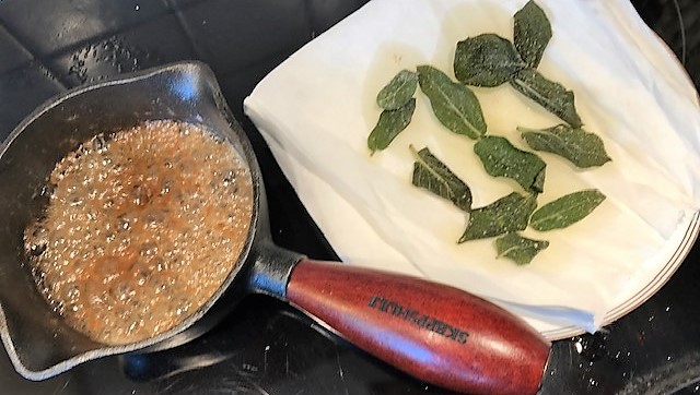 Stekt spetskålen i smör och rapsolja tills den mjuknar lite. Salta och peppra. Fräs salviablad i 50 g smält smör tills dom ”drar ihop” sig lite och låt rinna av på papper (dom ska bli lite krispiga när dom torkar). Hacka ansjovisfiléerna och rör ner dem i det smälta smöret.