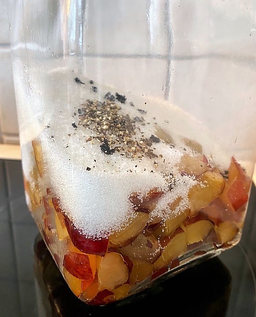 Skär plommonen i tärningar. Lägg den uppskurna frukten i en glasburk.