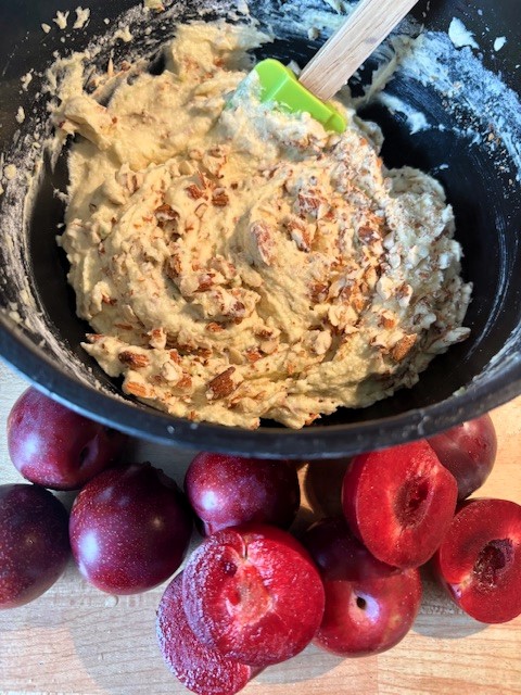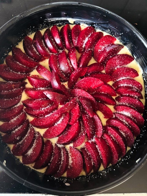 Lägg plommonklyftorna ovanpå smeten. Strö över 1 msk socker och grädda mitt i ugnen ca 55 minuter–1 timme. Låt kakan svalna i formen i 15 minuter.