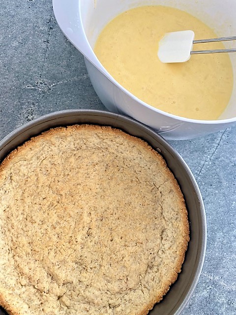 Sänk ugnstemperaturen till 200°C och blanda alla ingredienser till fyllningen, häll sen i pajskalet. Grädda ca 30 minuter i nedre delen av ugnen.