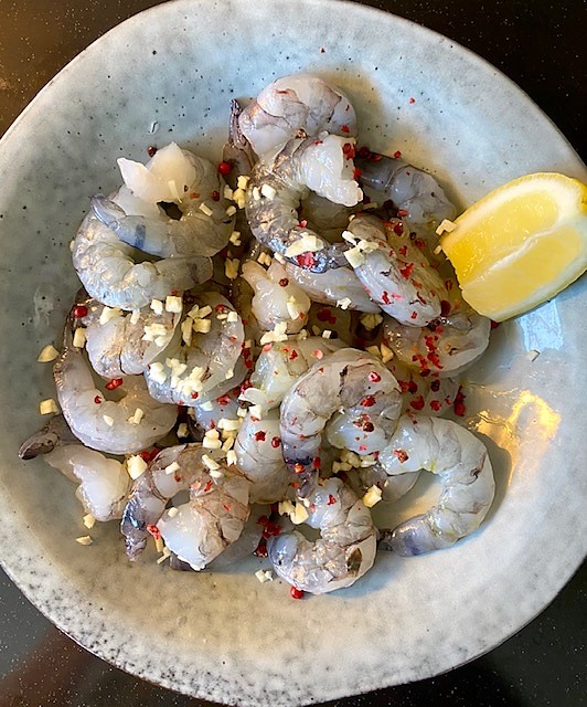 Blanda hackad vitlök och chili med citronsaft och olja. Marinera räkorna i kylen tills det är dags att börja grilla.