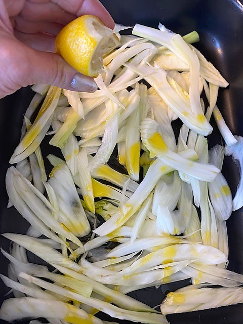 Skiva fänkål tunt, lägg i en ugnsfast form, ringla på olivolja, pressa över citron, salt, peppar och tillaga mitt i ugnen ca 10-15 minuter.
