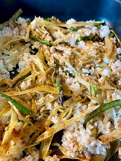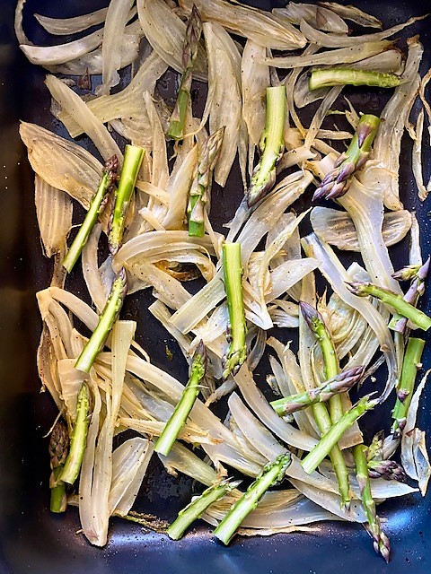 Ta ut formen ur ugnen och blanda fänkålen med riset. Ansa och halvera sparrisen på längden och lägg i även dem. Fortsätt tillaga ca 5-10 minuter till.