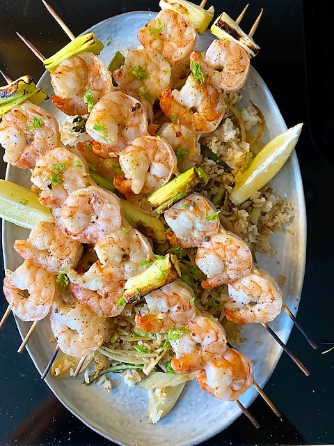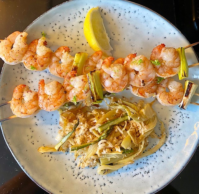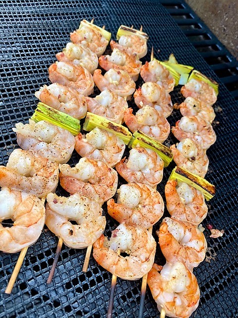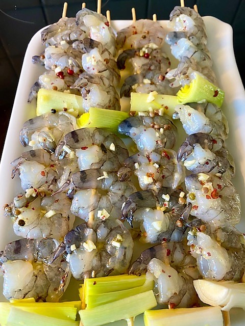 Trä upp scampi och purjolök på grillspett. Salta och peppra lätt.