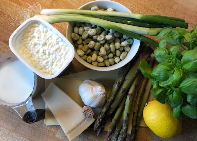 Vispa ihop färskost med ägget och riv ner muskotnöt efter smak. Bred ut blandningen över lasagnen och lägg på sparrisen och riven parmesanost. Tillaga mitt i ugnen ca 1 timme tills den fått fin färg och du lätt kan dela den med en kniv. Håller sig i upp till 2 dagar i kylen.