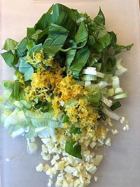 Värm ugnen till 200 grader. Hetta upp mjölken i en kastrull och tillsätt bondbönorna. Koka ca 3 minuter tills bönorna tinat och tillsätt sen vitlök, basilika, limezest, vårlök och buljongtärning. Ta av från värmen och kör med en mixerstav till en grov puré.