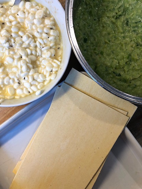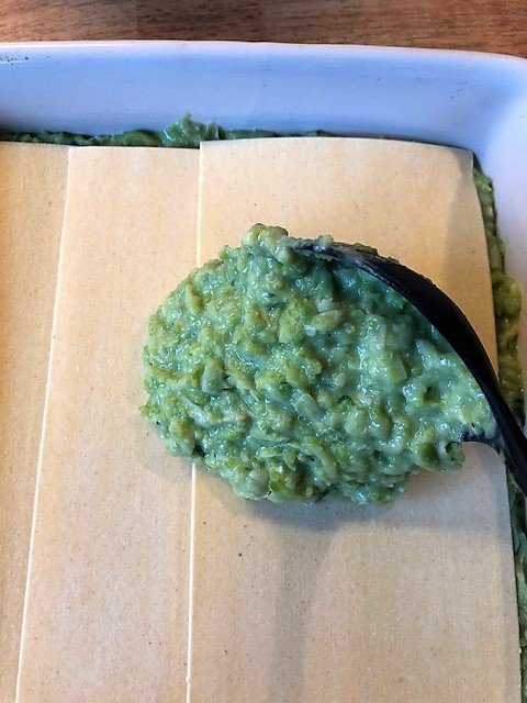 Lägg över hälften av purén i en ugnsfast form, lägg på 3 lasagneplattor, resten av purén samt de gröna ärtorna, 3 lasagneplattor till.