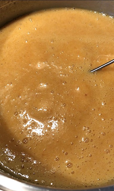Ta från värmen och rör i konjak. Låt svalna något och häll upp i en glasburk med lock. Förvaras i kylskåp och håller ganska länge.