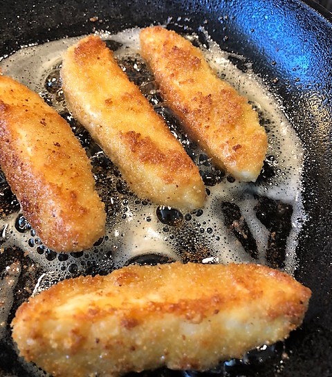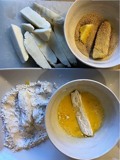 Rulla stavarna i mjöl, doppa sen i ägget och avsluta med ströbröd.