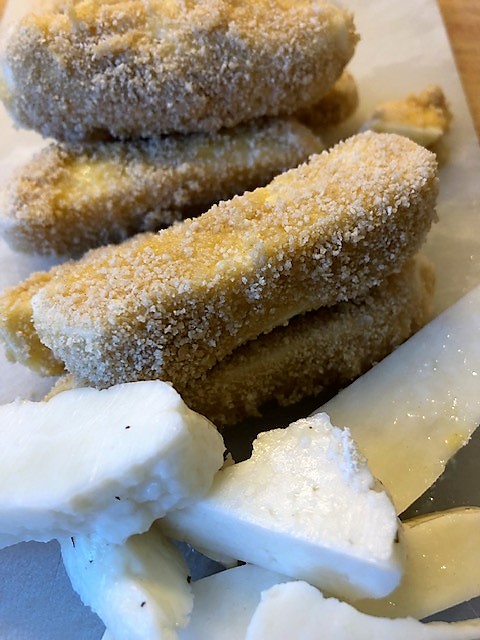 Skär halloumin i stavar. Vispa upp ägget, häll upp mjöl och ströbröd i separata skålar/tallrikar.