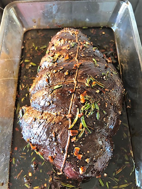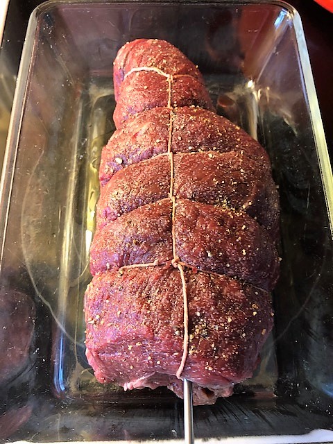 Köttbiten jag tillagade var ganska ojämn i formen. Det gjorde inte så mycket eftersom en i middagssällskapet är gravid och föredrar välstekt kött. Men en god idé är att binda upp köttet, så det blir jämnt tillagat.