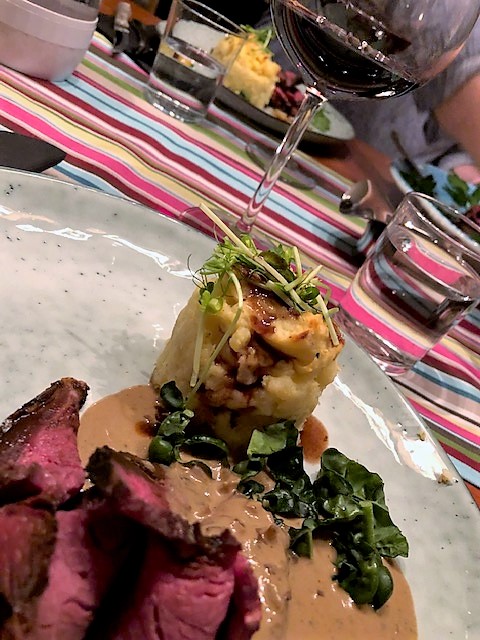 Lättlagad helstekt rostbiff som först tillagas i ugn och sen får ligga i en marinad i kylen över natten innan den skärs upp i tunna fina skivor. Passar med många olika såser och tillbehör. Här serverade jag den med potatispuckar och grönpepparsås. Underbart gott.