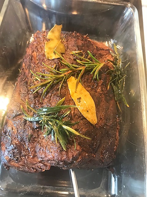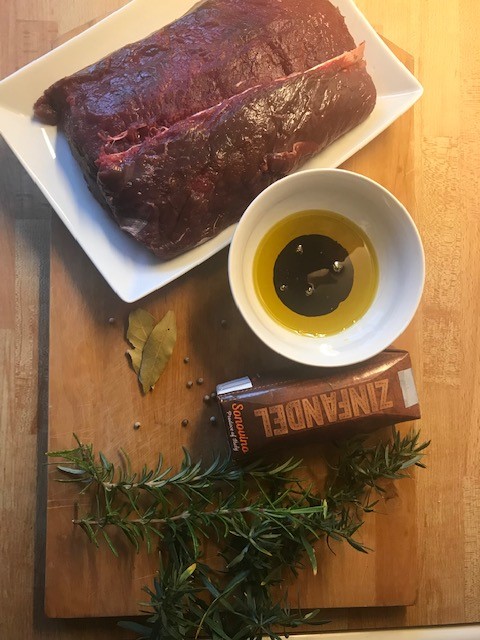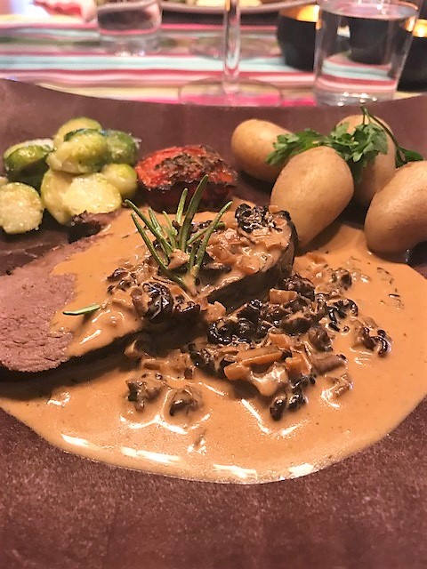 Riktig söndagsmiddag! En hel bit ryggbiff tillagad på låg ugnsvärme. Detta receptet går utmärkt att använda även till andra köttslag än hjort. Tillbehören går ju att variera efter det som finns i säsong och vad man tycker om. Jag serverade ryggbiffen med kokt mandelpotatis, murkelsås och smörslungad brysselkål med parmesan och en klick svartvinbärs gelé. Riktigt gott!