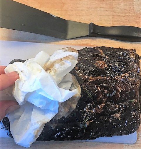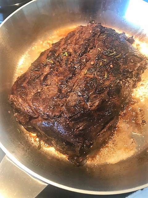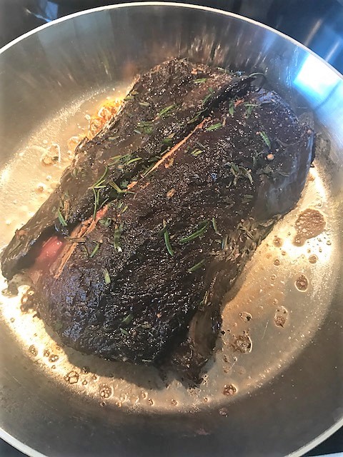 Värm ugnen till 150 grader. Ta köttet ur marinaden och torka av det lite. Krydda med salt och peppar runt om. Bryn sen i smör och olja runt om. Lägg över i en ugnsfast form, gärna tillsammans med de hela örtkvistarna från marinaden. Tillaga mitt i ugnen tills innertemperaturen når 57 grader, då är köttet medium.