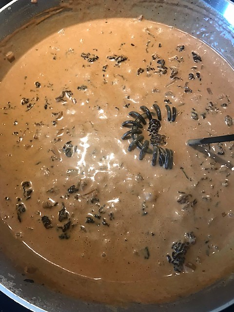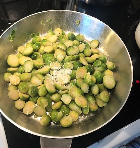 Medan köttet står i ugnen kokar du potatis. Koka även brysselkål så den fortfarande har tuggmotstånd och stek sen halverade i smör, salta peppra och strö på riven parmesanost.