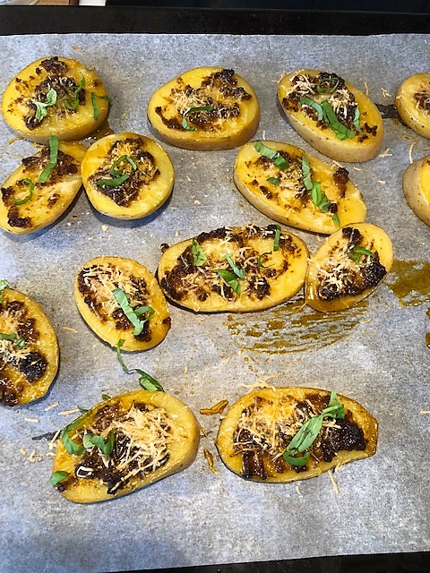 Medan steken står i ugnen delar du potatisen i stora skivor och kokar dem i lättsaltat vatten tills de är nästan färdiga. Häll av vattnet och lägg skivorna på en bakplåtsklädd form. Täck varje skiva med ett lager pest och strö på riven parmesanost. Ställ in potatisen i ugnen och tillaga tills osten smält och de är genomvarma.
