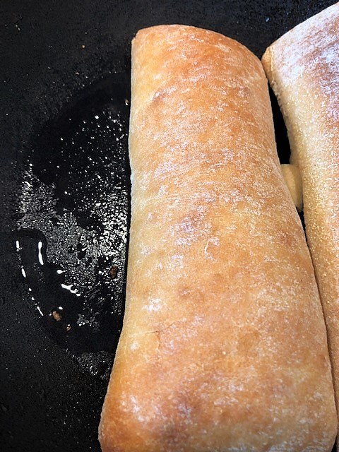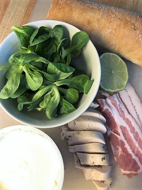 Skär ett snitt längs med baguetten så den öppnar sig, men ändå håller ihop. Pensla insidorna av brödet med fettet som bildades när du stekte baconet. Lägg på machésallad, crème fraiche blandningen, kyckling och toppa med bacon. Hugg in!