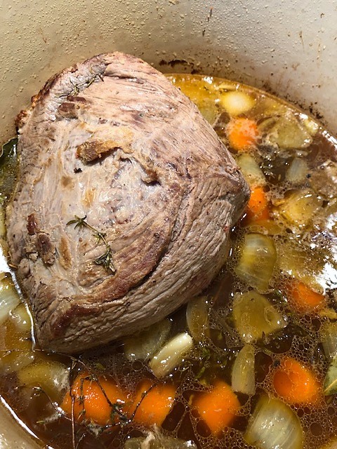 Värm ugnen till 175 grader. Krydda kalvsteken med salt och peppar och bryn den runt om i en hög ugnssäker gryta. Lägg i morötter, lök och kryddor. Sätt i en köttermometer i köttets tjockaste del och ställ in grytan i ugnen på nedersta falsen. Stek utan vätska i ca 20 minuter. Häll sen på buljongen och ös steken några gånger med vätskan under tillagningen. Steken är rosa vid 65 grader och tar ca 1 timme. Ta upp köttet och låt det vila medan du tillagar såsen.
