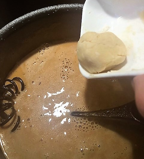 Sila kalvbuljongen och koka ihop till ca 3 dl återstår. Tillsätt grädde och vinbärsgelé och koka upp. Blanda smör och vetemjöl till beurre Manié och vispa ner det i såsen. Låt småkoka under omrörning ca 5 minuter. Smaka av med ansjovisspad, soja, cayennepeppar, salt och peppar.
