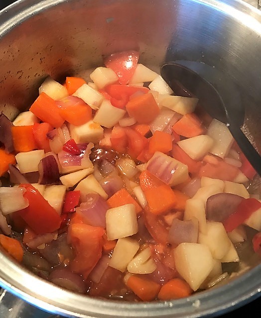Skala, putsa och grovhacka rotselleri, morot, rödlök, chilifrukt, vitlök och tomat. Hetta upp olja i en kastrull. Bryn grönsakerna, de ska ta lite färg med får inte bli brända. Strö över socker och låt det börja karamelliseras. Häll på vinägern och koka till det får en sirapslik konsistens. Häll på vinet och koka till 1/3 av vätskan återstår, ca 15 minuter. Tillsätt kalvfond och vatten. Småkoka ca 15 minuter och sila sen över soppan i en ny kastrull. Häll på maizena, koka ihop så att såsen tjocknar något och smaka av med salt och nymalen svartpeppar. Såsen går utmärkt att göra dagen före den ska serveras.