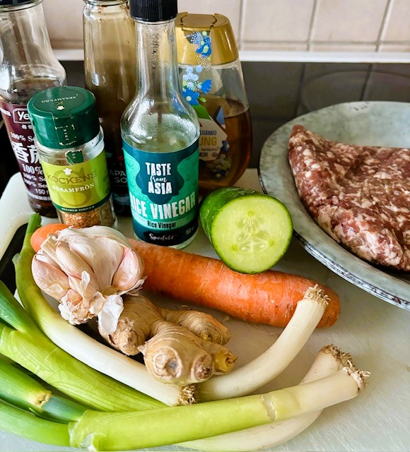 Om du hinner så lättpickla gärna gurkan under tiden du tillagar köttfärsen och ev riset, genom att blanda ihop2 matskedar risvinäger, 2 matskedar vatten, 1/2 tsk socker och 1/2 tsk salt i en stor skål. Lägg i den skivade gurkan och ställ i kylskåpet så länge.