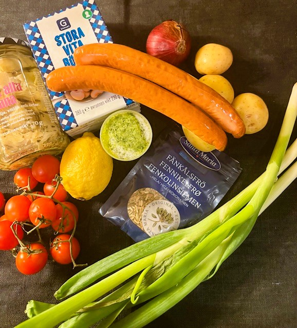 Blanda rödlök, potatis, kronärtskockor, tomater, salladslök, korvar, fänkålsfrö och citronklyftor på en bakplåt eller ugnsform ca 20 x 20 cm.