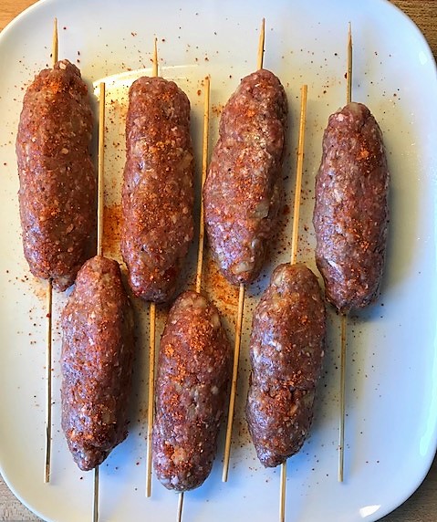 Börja med att blötlägga träspetten och tända grillen. Blanda samman alla ingredienserna väl i en bunke. Forma sen 8 st avlånga köttbullar runt spetten och pensla dem med olja. Grilla runt om tills de fått fin färg och är klara. Servera!