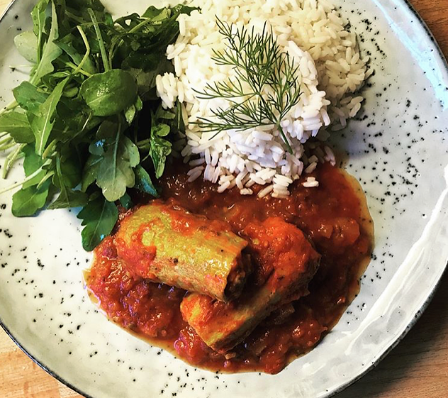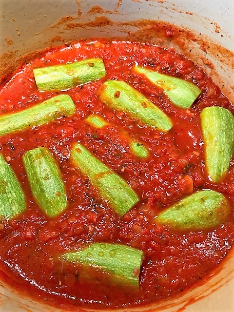 Häll på vatten så det precis täcker, sänk värmen, lägg på ett lock och låt puttra 20-30 minuter tills zucchinin blivit mjuk. Vill du ha tomatsåsen tjockare tar du upp zucchinin och reducerar såsen en stund. Servera med kokt ris och en fräsch sallad.