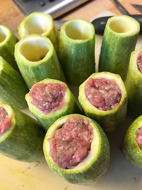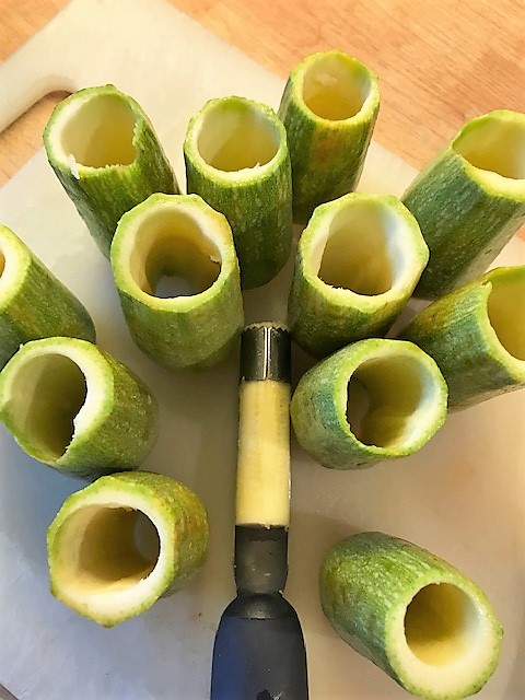 Under tiden förbereder du resten. Gröp ur innanmätet på zucchinin. Fungerar bra att använda en urkärnare för äpplen. (Släng inte det du tar ur, utan spara det till en god soppa eller riv och blanda ner i en köttfärssås).