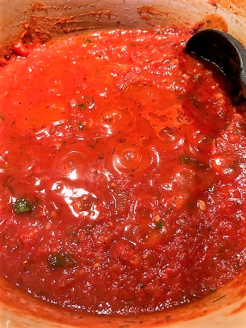 Börja med att göra tomatsås. Stekt 1 hackad gul lök i lite olja, tillsätt tomatpuré, balsamvinäger, krossade tomater och Herb de Provence. Låt puttra ihop ca 30 minuter och smakade av med salt, svart- och cayennepeppar.