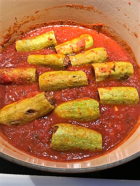 Blanda färsen med 1 hackad gul lök, salt, peppar och persilja i en bunke. Fyll sedan zucchinin med färsen och lägg ner i tomatsåsen.