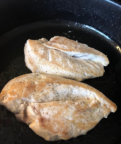 Spraya lite olivolja i en teflonpanna. Salta och peppra på kycklingen och stek den ca 10 minuter tills den får fin färg. Vänd efter halva tiden. Lägg sen åt sidan.