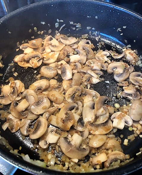Stek sen löken i lite mer olja ca 2-3 minuter och tillsätt sen även vitlöken. Stek en minut och tillsätt champinjonerna. Stek tills de får fin färg. Om det blir för torrt i pannan kan man hälla i lite av buljongen.