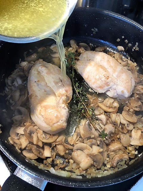 Lägg tillbaks kycklingen i pannan och häll på buljongen. Lägg i hälften av timjankvistarna. Lägg på ett lock och låt alltsammans puttra ca 15 minuter.